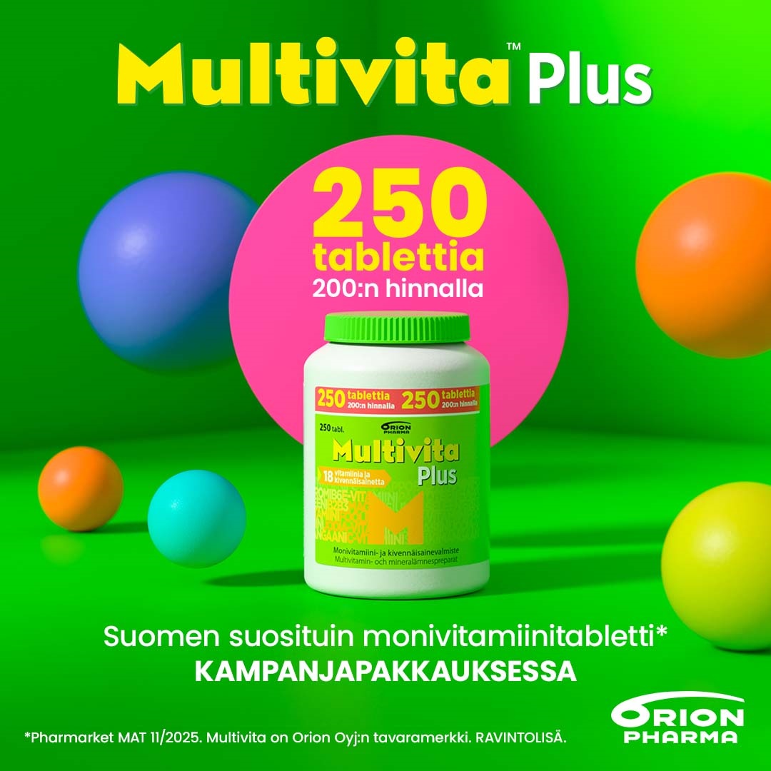 Suomen suosituin* monivitamiini- ja kivennäisainetabletti, jonka koostumus on suunniteltu erityisesti aikuisille. Yhdessä tabletissa jopa 18 päivittäin tarvittavaa vitamiinia ja kivennäisainetta.